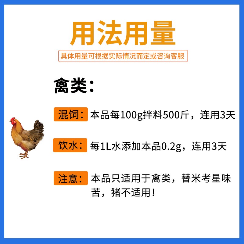 - 使用方法:以本品计。混饮:每1L水,鸡0.2g。连用3日。