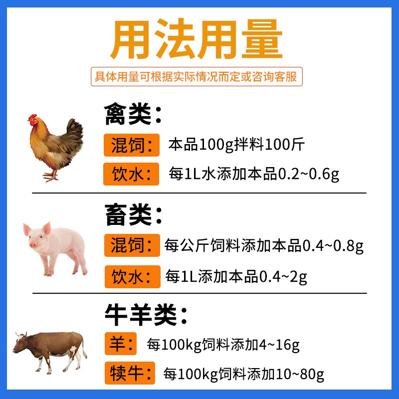 - 使用方法:以本品计。混饮:每 1L水,猪 0.4~2g,鸡 0.2~0.6g;混饲:每1kg 饲料,猪 0.4~0.8g。