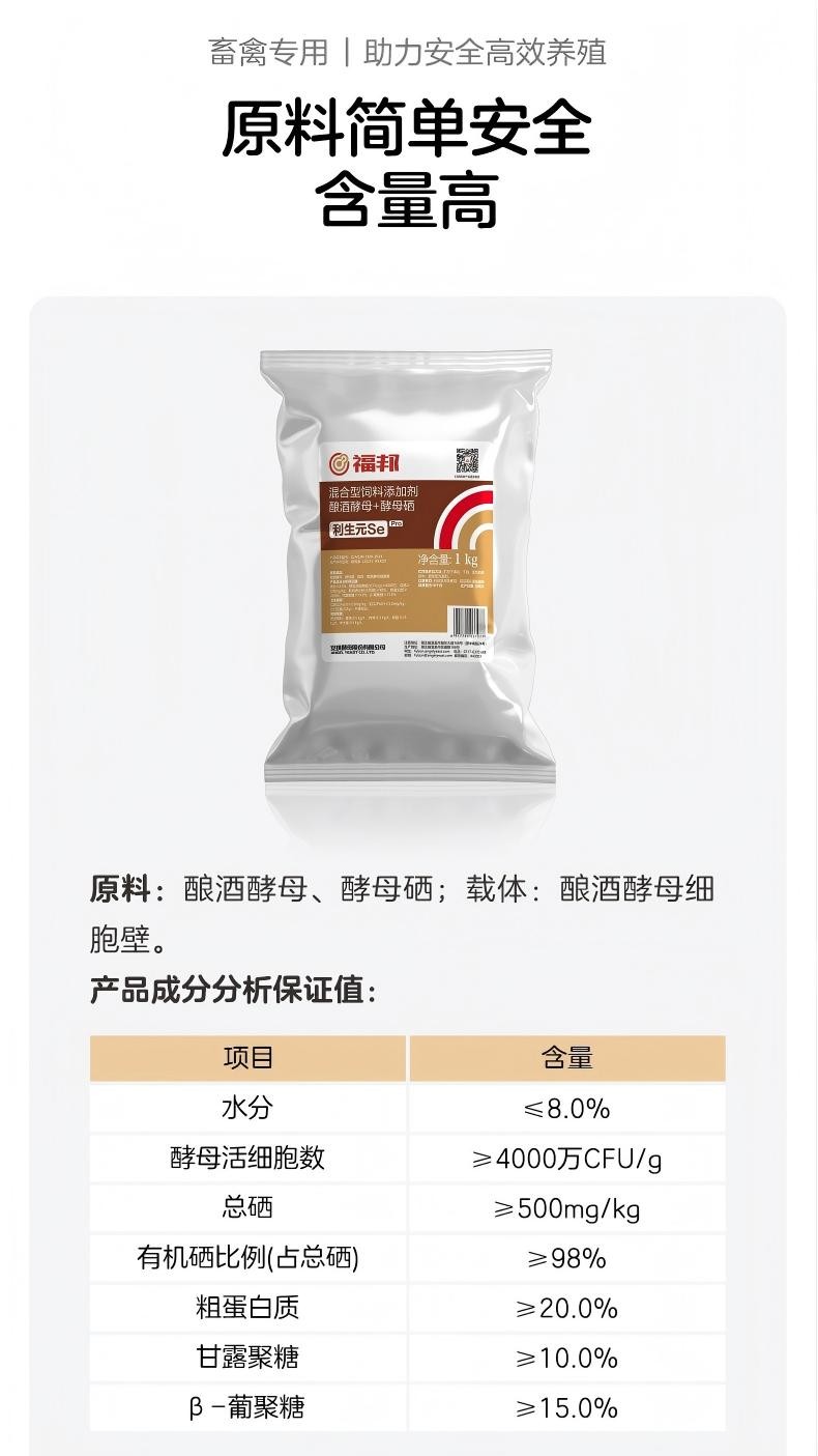 商品名称:安琪福邦酵母硒利生元se pro饲料添加剂吸附霉菌酿酒酵母禽畜专用 商品编号:E82002333 品牌:安琪酵母 上架时间:2025-07-10 商品净重:1.000千克 质保期:18个月