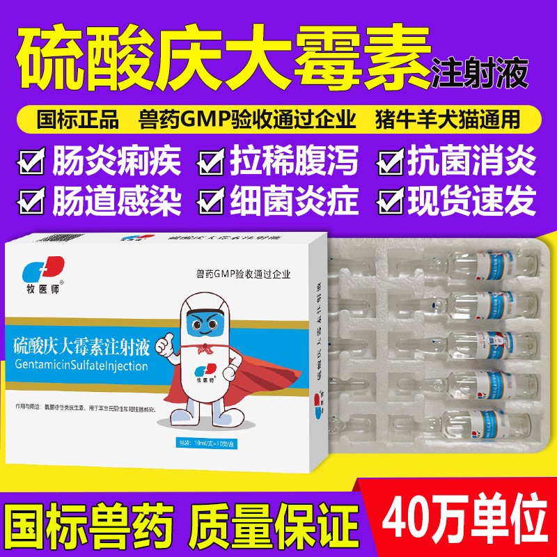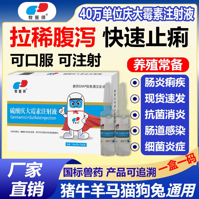 商品名称:兽药40万单位庆大霉素注射液猪牛羊犬猫拉稀腹泻抗菌消炎肠炎痢疾 商品编号:ZHUEJPH0005118603 品牌:牧医师 上架时间:2025-08-18 商品净重:10克 产品批文号:兽药字161721507