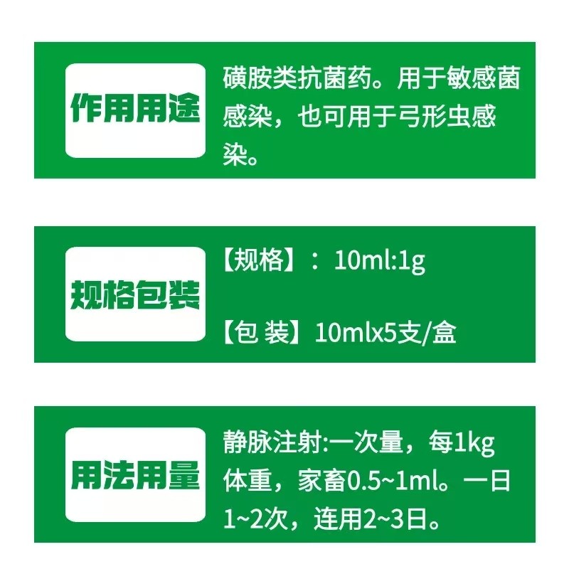 - 商品名称:【鼎合牧高】10%磺胺嘧啶钠注射液10ml*5支/盒 磺胺类抗菌药 用于敏感菌感染也可用于弓形虫感染