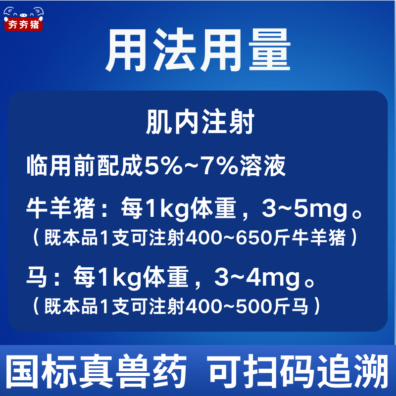 - 使用方法:肌内注射:一次量,每1kg体重,马3~4mg;牛、羊3~5mg。临用前配成5%~7%溶液。