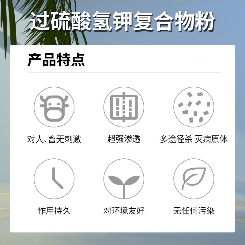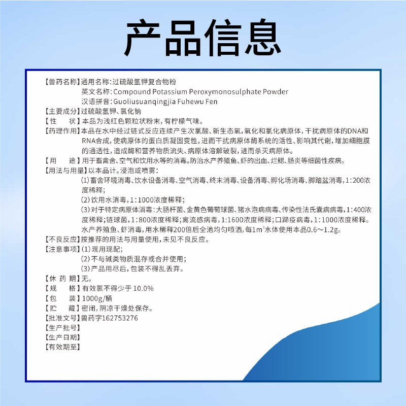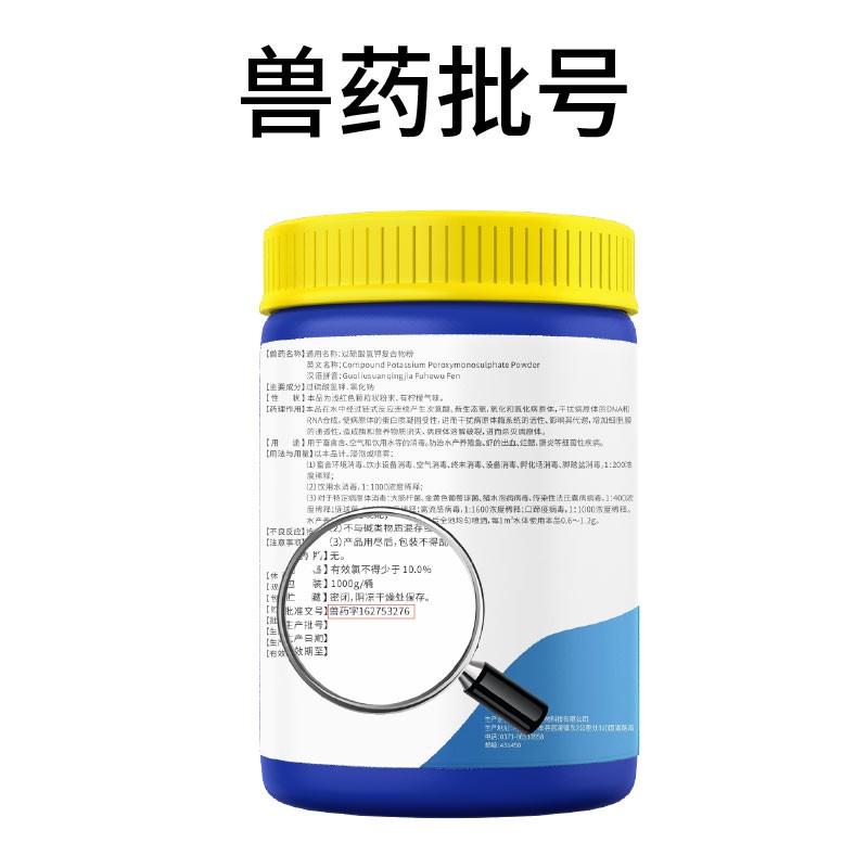商品名称:白云牧港国标兽药过硫酸氢钾消毒粉非洲猪瘟鸡舍牛羊非瘟消毒液养殖场专用 商品编号:ZHUEJPH0009818629 品牌:白云牧港 上架时间:2025-08-23 商品净重:1.000千克 产品批文号:兽药字162753276