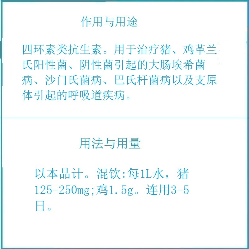 商品名称:【予邦】20%盐酸多西环素可溶性粉100g 兽用兽药 国标可追溯 四环素类抗生素 抗菌细菌感染 商品编号:ZHUEJPH0001918647 品牌:予邦兽药 上架时间:2025-09-08 商品净重:100克 主要成分:盐酸多西环素 保质期:2年 生产厂家:四川积善之家药业有限公司 产品批文号:兽药字221292844