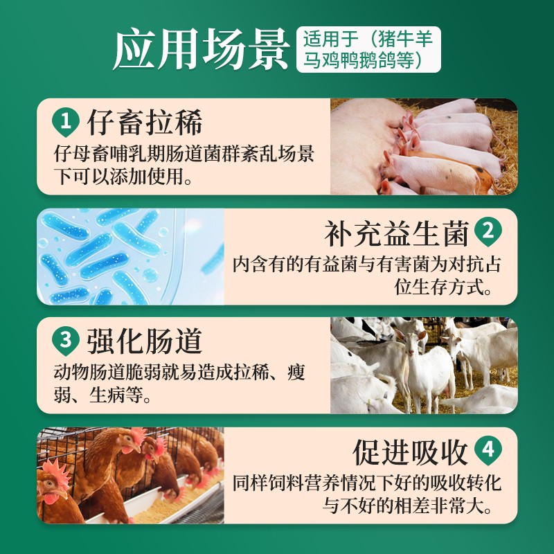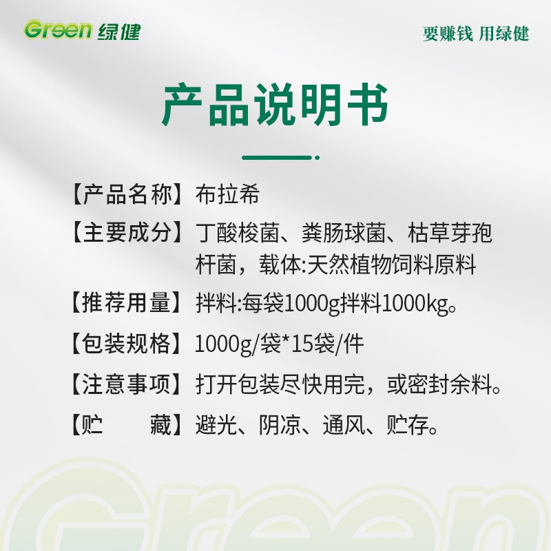 商品名称:【绿健兽药】布拉希1000克天然植物饲料添加剂枯草芽孢杆菌 丁酸梭菌 用于拉稀肠道调理 商品编号:ZHUEJPH0005818685 品牌:Green绿健 上架时间:2025-11-04 商品净重:1.000千克 产品批文号:Q/RG001-2020
