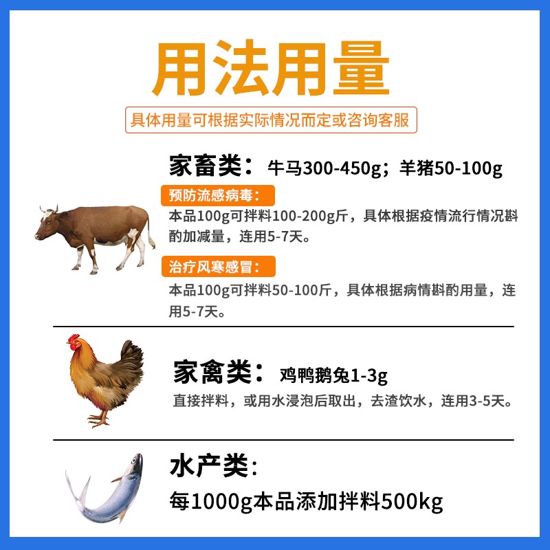 - 使用方法:马、牛300-450g;羊、猪50-100g;兔、禽1-3g。