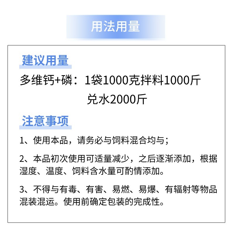商品名称:【九天生物】多维钙+磷1kg/袋猪用微量元素钙磷十八补异食癖吃吐喝尿咬耳咬尾母猪保健补钙抗应激添加剂 商品编号:ZHUEJPH0004118703 品牌:河南九天生物科技有限公司 上架时间:2025-11-26 商品净重:1.000千克 使用方法:拌料1000斤,兑水2000斤 质保期:18个月