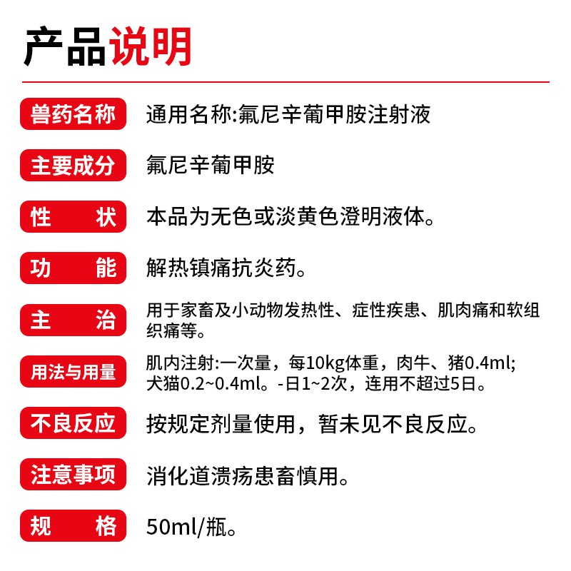 商品名称:【开扬】 氟尼辛葡甲胺注射液 50ml 解热镇痛抗炎退烧止痛抗炎 商品编号:ZHUEJPH0002418739 品牌:开扬 上架时间:2025-12-22 商品净重:50克 产品批文号:兽药字162082103