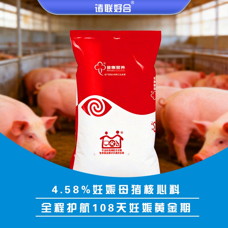 商品名称:【诸孕好】4.58%妊娠母猪核心料 配种后—108天使用 攻胎不换料 预混料 怀孕料 妊娠料 商品编号:5458 品牌:普惠营养 上架时间:2026-03-26 商品净重:11.450千克 适用阶段:妊娠母猪(配种后---产前1周) 添加比例:4.58% 饲料类型:预混料 阶段分类:母猪料