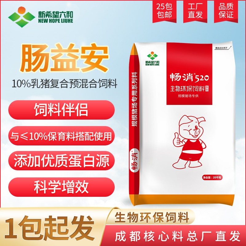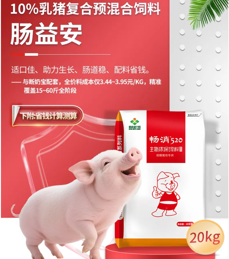 商品名称:【新希望畅消】10%乳猪复合预混合饲料-YC10-肠益安 与10%乳猪料cx110断奶宝搭配使用 商品编号:ZHUEJPH0002618806 品牌:新希望六和 上架时间:2026-04-01 商品净重:20.000千克 适用阶段:保育(10kg-25kg) 添加比例:10% 饲料类型:预混料 阶段分类:保育料