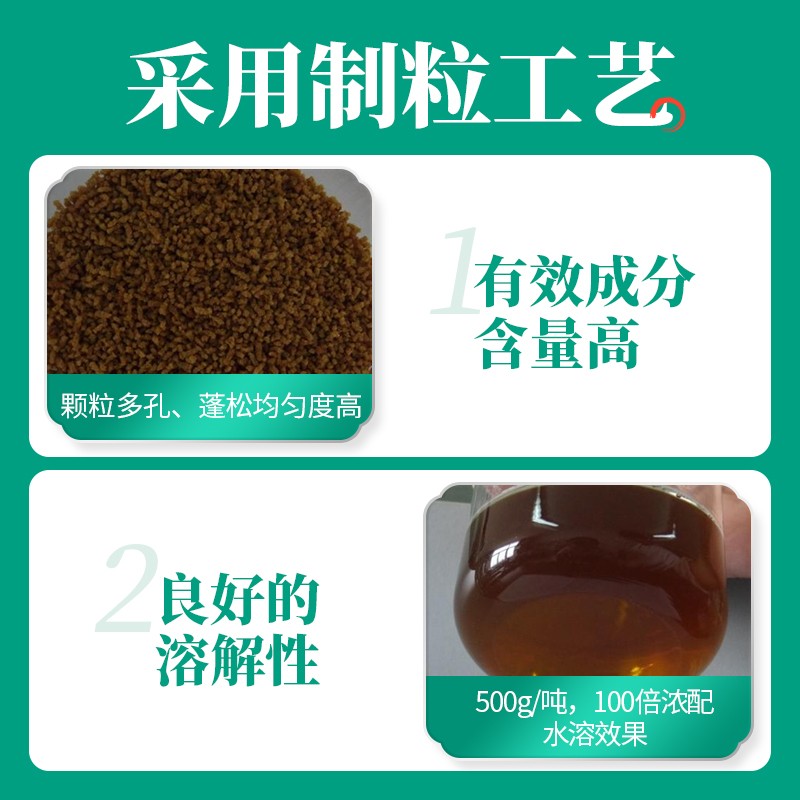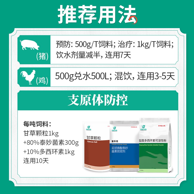 - 使用剂量:预防:500g袋/2000斤 治疗:500g袋/1000斤;饮水剂量减半