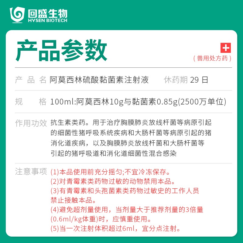 - 商品名称:【回盛生物】#联益康 10%阿莫西林硫酸黏菌素注射液100ml 治疗胸膜肺炎大肠杆菌病仔猪黄白痢