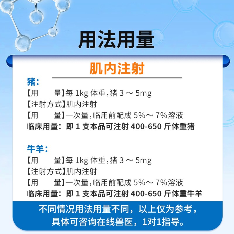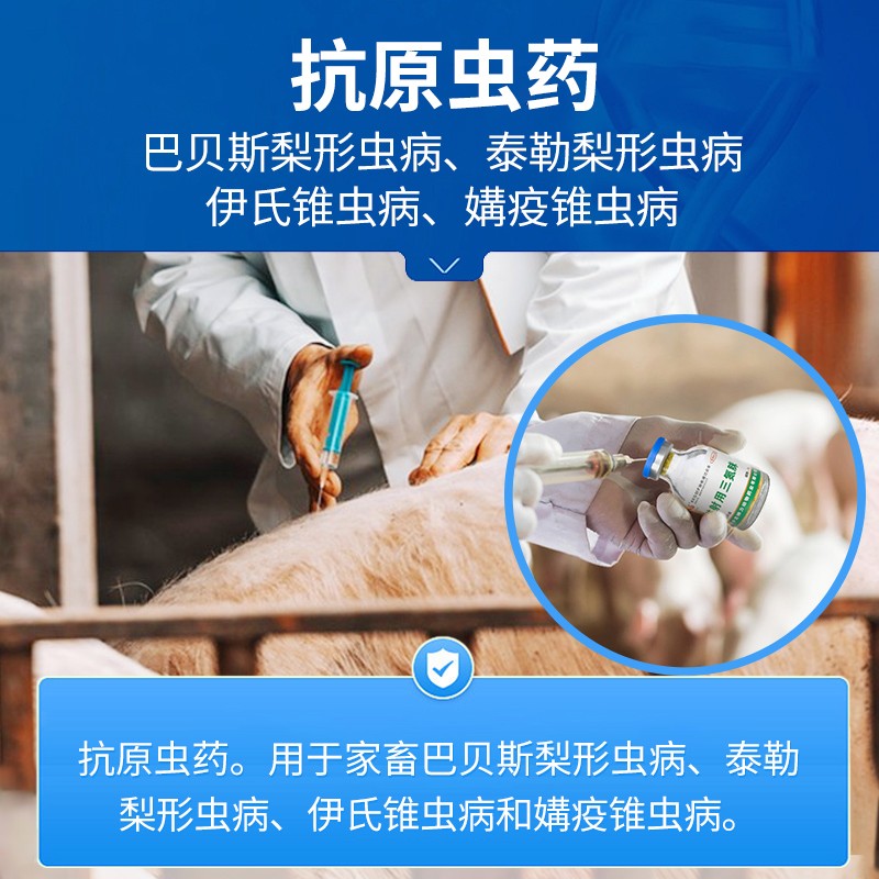 管理员:注射用三氮脒 用法用量:一次量,每1kg体重,马3-4mg;牛羊3-5mg。即使用20毫升生理盐水稀释,1瓶本品可以注射:马500-600斤体重;牛、羊:400-600斤体重。本品只需注射1次,不建议超量。孕畜不建议使用!!!