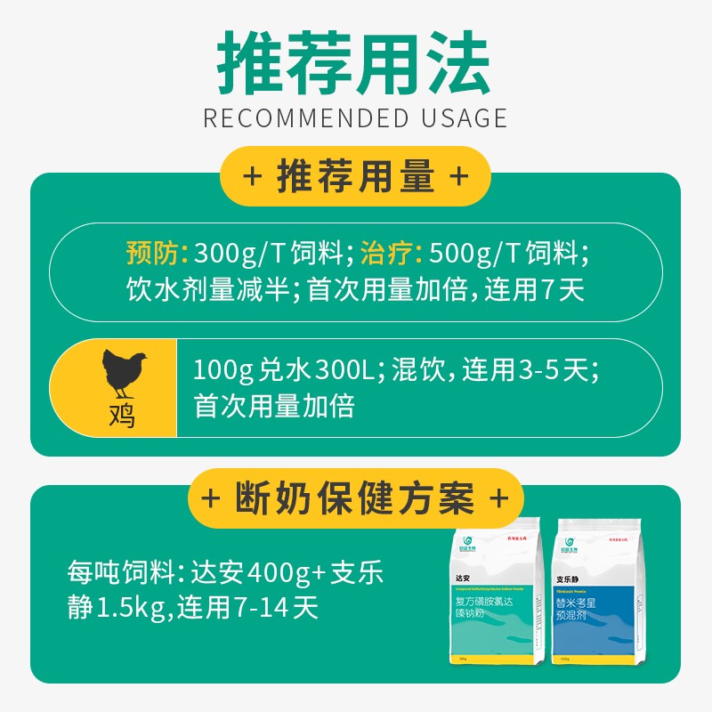 - 使用剂量:预防:300g/T饲料;治疗:500g/T饲料;饮水剂量减半