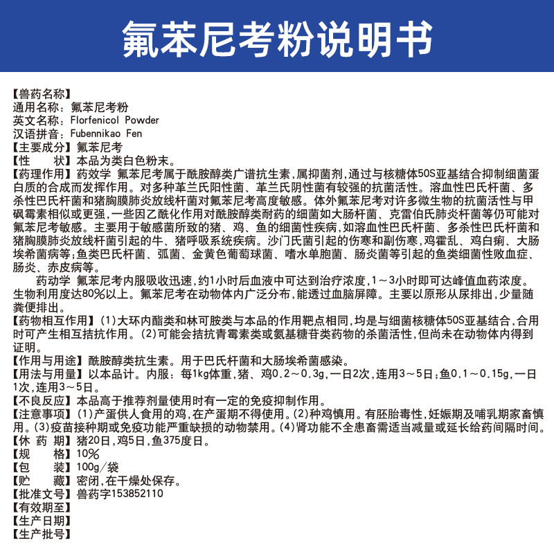 - 商品名称:【吉博士】10%氟苯尼考粉100g 呼吸道疾病大肠埃希菌